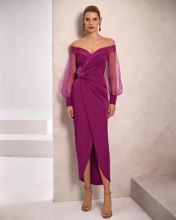 Vestido de fiesta midi. Confeccionado en crepé satén. Escote corazón. Mangas de organza. Flor en cuerpo. Incluye chal.