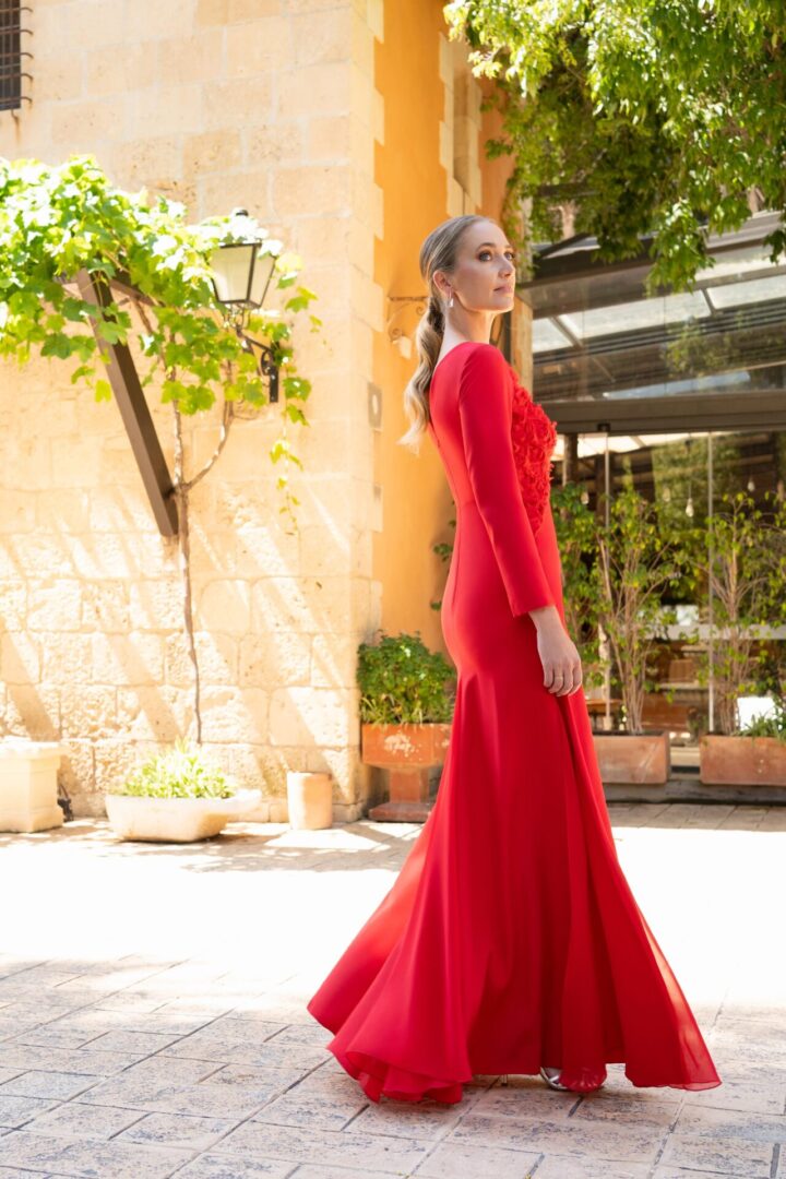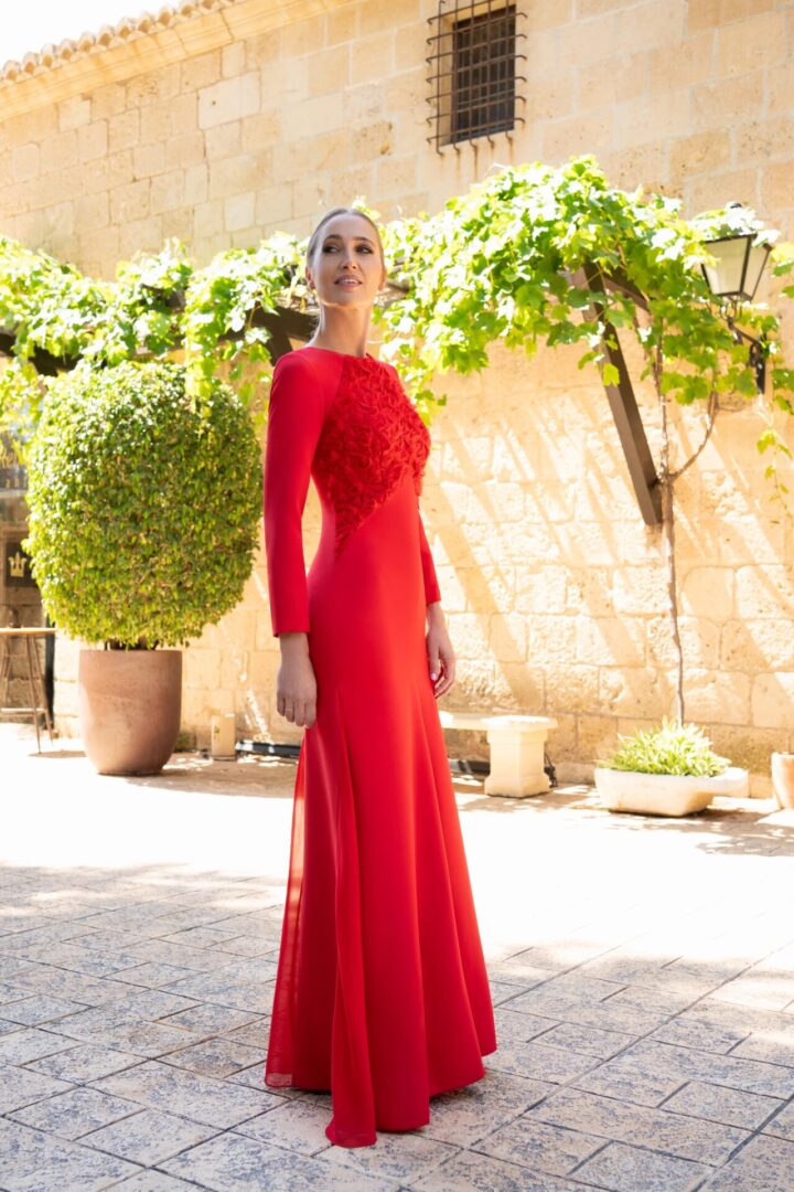 Este vestido en crepe rojo intenso pertenece a la colección Eleganza, pensada para madres que buscan destacar con fuerza, estilo y sensibilidad. Confeccionado en un tejido fluido y estructurado a la vez, su diseño presenta un cuerpo entallado decorado con una delicada textura de pétalos en relieve, que aporta volumen, luz y carácter.