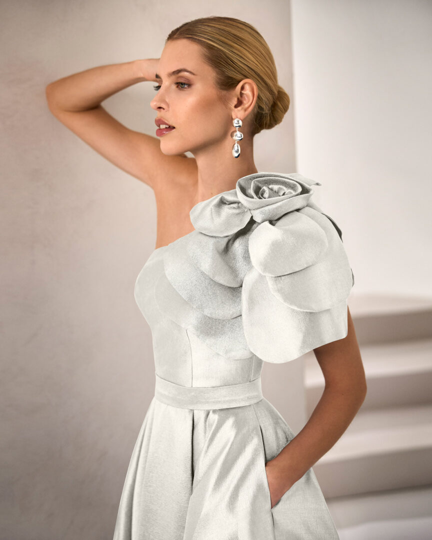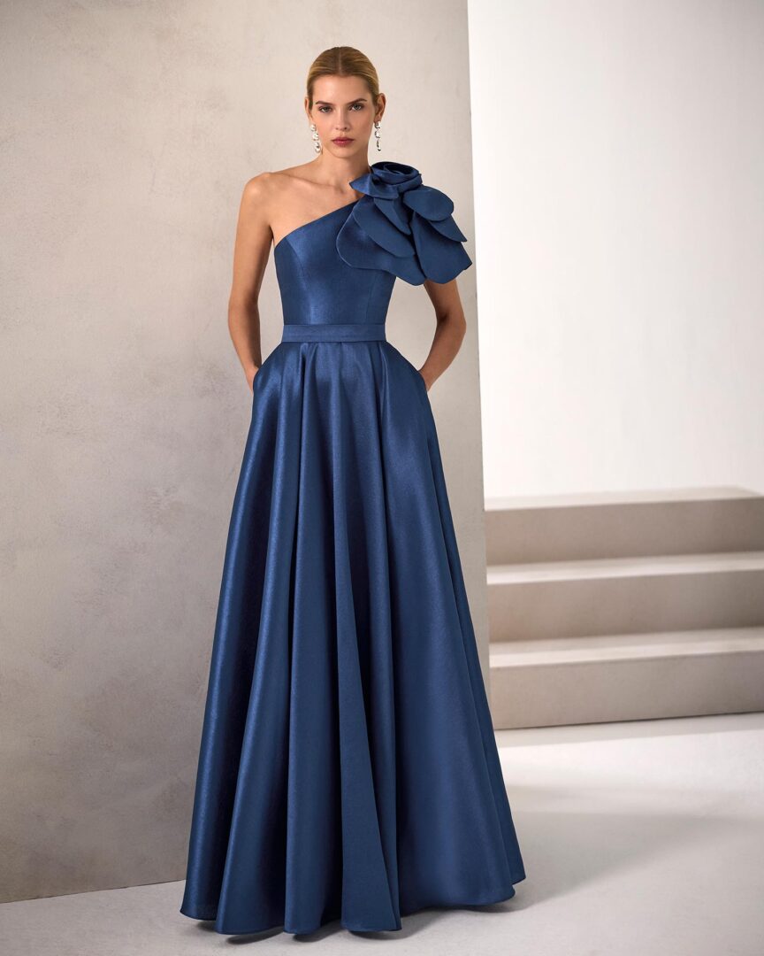 Vestido de fiesta largo. Confeccionado en tafetán. Escote asimétrico. Detalles florales. Incluye chal.