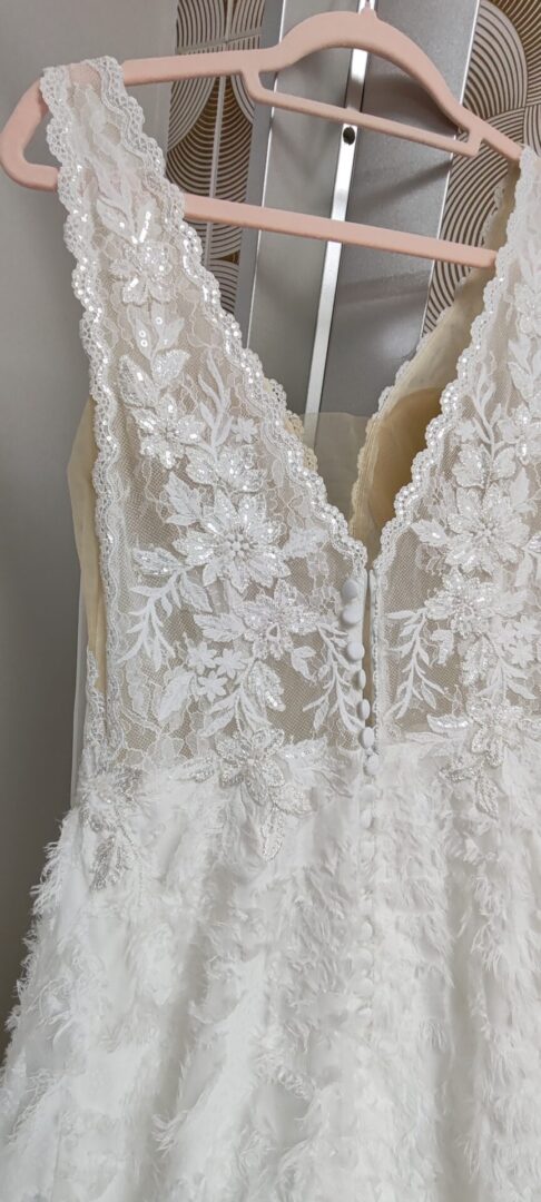 Vestido de novia de corte A con cuerpo de encaje y pedrería y tirantes anchos.