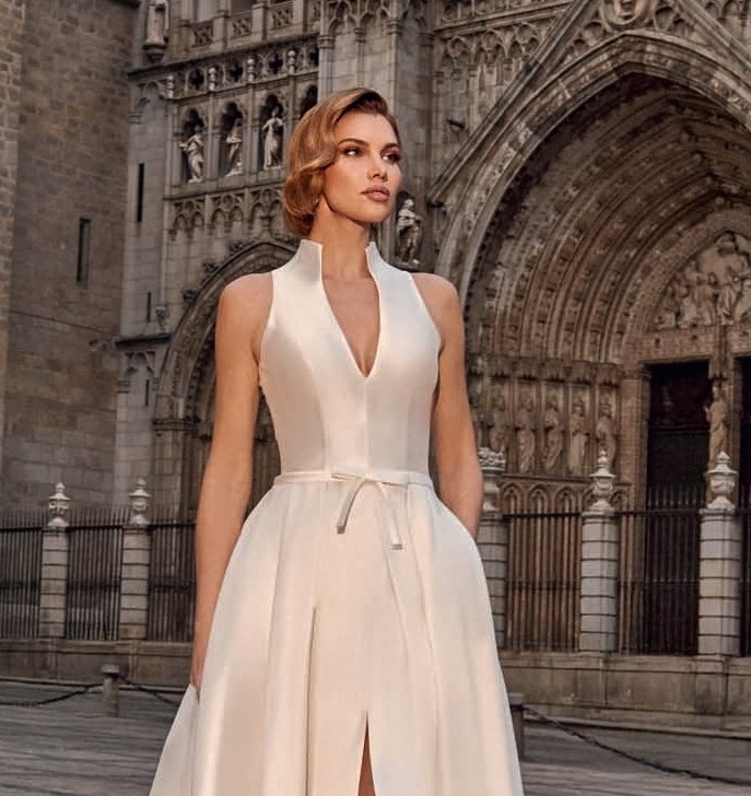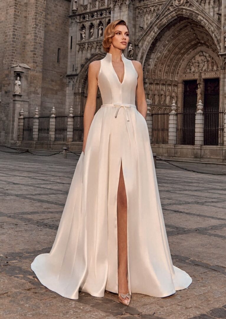 Vestido de novia liso, con abertura delantera y cuello mao. Detalle en cintura.