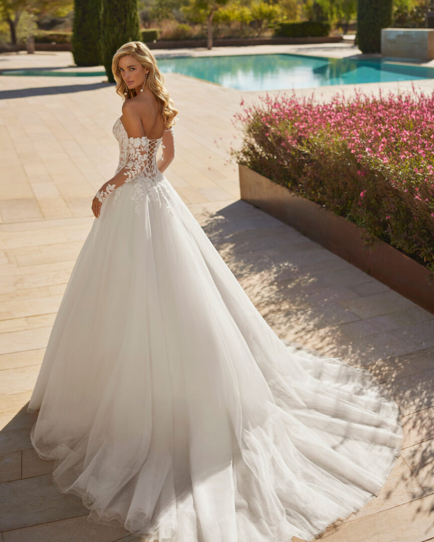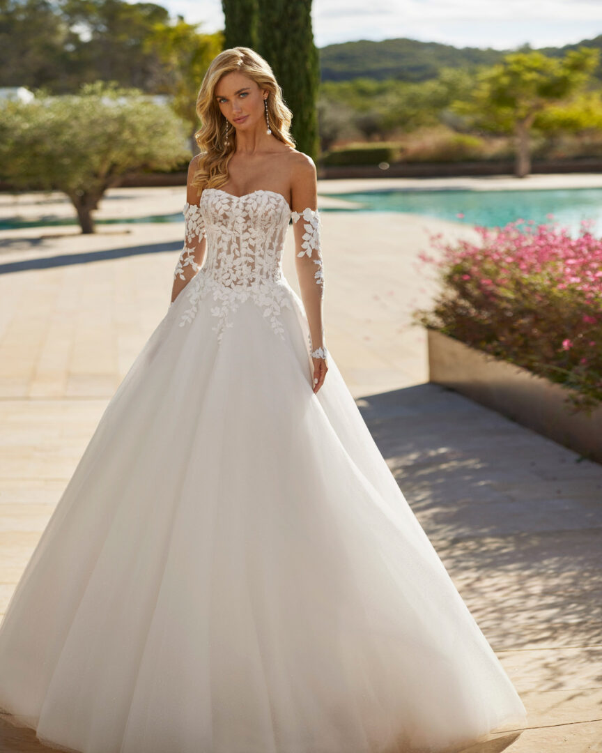 Vestido de novia largo de volumen en tul con cuerpo de encaje, pedrería, escote palabra de honor, mangas extraíbles y espalda corsé.